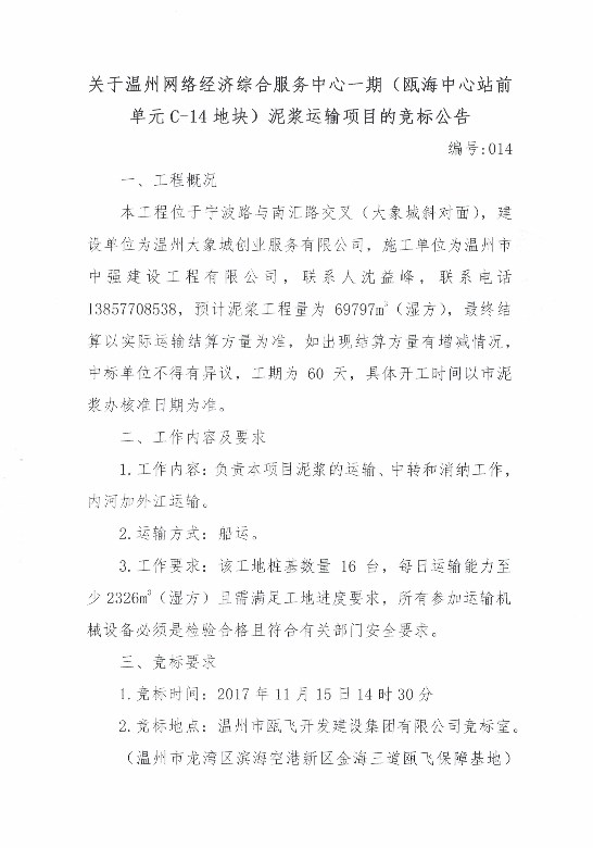 ¹ØÓÚÎÂÖÝÍøÂç¾¼Ã×ÛºÏЧÀÍÖÐÐÄÒ»ÆÚ£¨ê±º£ÖÐÐÄվǰµ¥Î»C-14µØ¿é£©ÄཬÔËÊäÏîÄ¿µÄ¾º±êͨ¸æ
