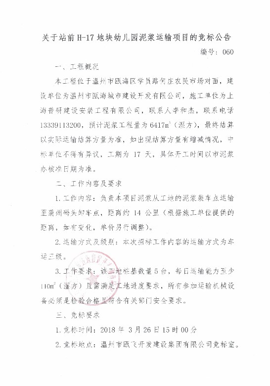 ¹ØÓÚվǰH-17µØ¿éÓ×¶ùÔ°ÄཬÔËÊäÏîÄ¿µÄ¾º±êͨ¸æ