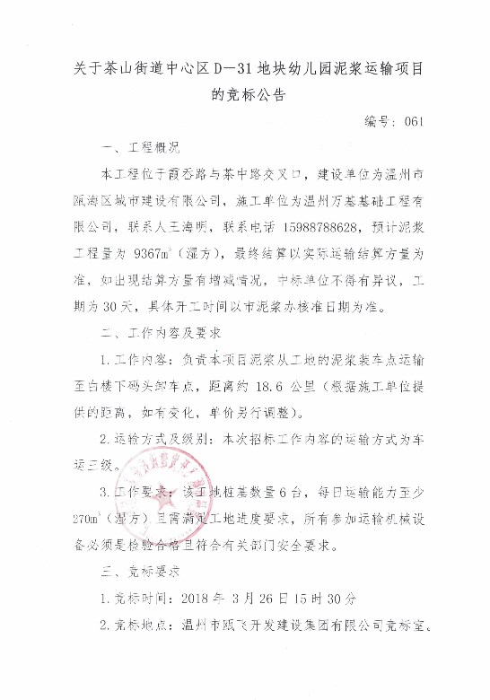 ¹ØÓÚ²èɽ½ÖµÀÖÐÐÄÇøD¨D31µØ¿éÓ×¶ùÔ°ÄཬÔËÊäÏîÄ¿µÄ¾º±êͨ¸æ