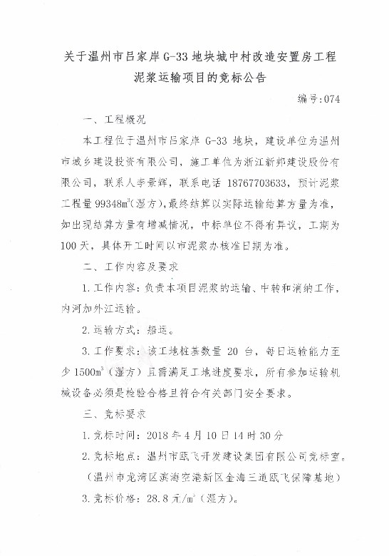¹ØÓÚÎÂÖÝÊÐÂÀ¼Ò°¶G-33µØ¿é³ÇÖдå¸ïа²¶Ù·¿¹¤³ÌÄཬÔËÊäÏîÄ¿µÄ¾º±êͨ¸æ