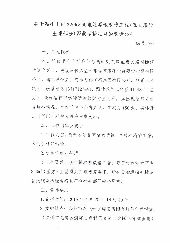 ¹ØÓÚÎÂÖÝÉÏÌï220kv ±äµçÕ¾Ò׵ظïй¤³Ì(»ÝÃñ·¶ÎÍÁ½¨²¿·Ö)ÄཬÔËÊäÏîÄ¿µÄ¾º±êͨ¸æ