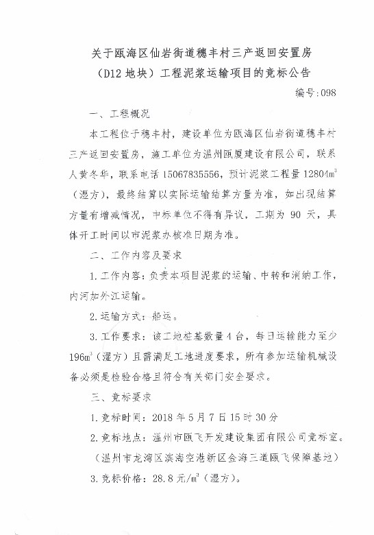 ¹ØÓÚ걺£ÇøÏÉÑÒ½ÖµÀËë·á´åÈý²ú·µ»Ø°²¶Ù·¿£¨D12µØ¿é£©¹¤³ÌÄཬÔËÊäÏîÄ¿µÄ¾º±êͨ¸æ