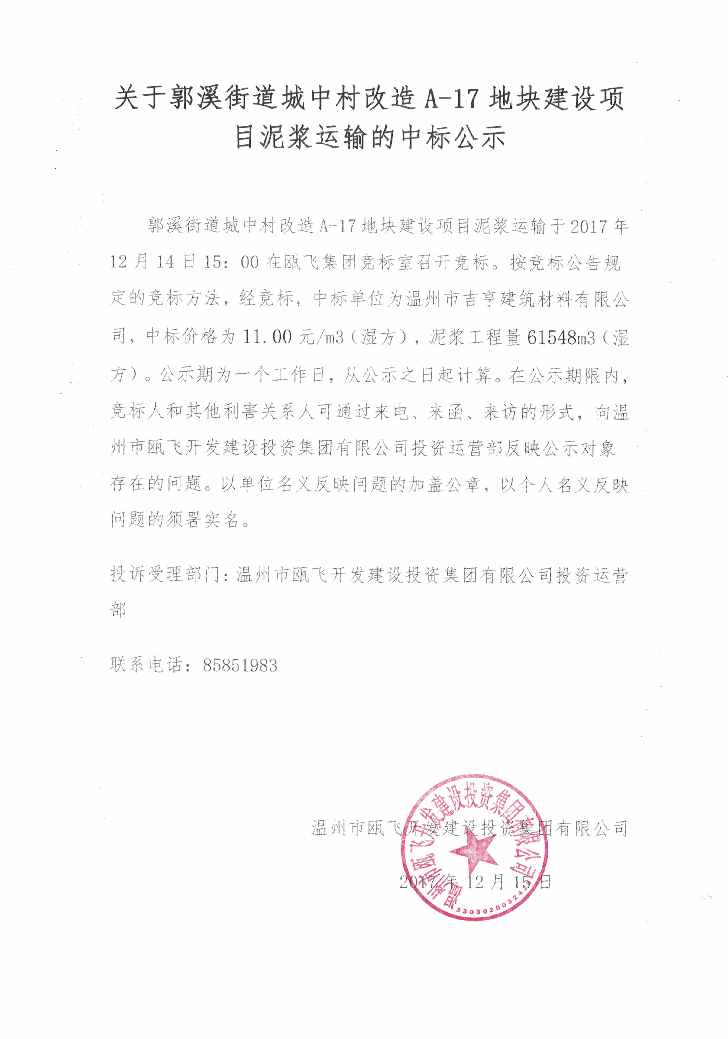 ¹ùϪ½ÖµÀ³ÇÖдå¸ïÐÂA-17µØ¿é½¨ÉèÏîÄ¿ÄཬÔËÊäÓÚ2017Äê12ÔÂ14ÈÕ15£º00ÔÚBOB°ëµº¼¯Ížº±êÊÒÕÙ¿ª¾º±ê¡£°´¾º±êͨ¸æ»®¶¨µÄ¾º±êÒªÁ죬¾¾º±ê£¬Öб굥λΪÎÂÖÝÊмªºà½¨ÖþÖÊÁÏÓÐÏÞ¹«Ë¾£¬Öбê¼Û¸ñΪ11.00Ôª/m3£¨Êª·½£©£¬Äཬ¹¤³ÌÁ¿61548m3£¨Êª·½£©¡£¹«Ê¾ÆÚΪһ¸öÊÂÇéÈÕ£¬´Ó¹«Ê¾Ö®ÈÕÆðÅÌËã¡£ÔÚ¹«Ê¾ÆÚÏÞÄÚ£¬¾º±êÈËºÍÆäËûÀûº¦¹ØÏµÈË¿Éͨ¹ýÀ´µç¡¢À´º¯¡¢À´·ÃµÄÐÎʽ£¬ÏòBOB°ëµºÍ¶×ÊÔËÓª²¿·´Ó¦¹«Ê¾¹¤¾ß±£´æµÄÎÊÌâ¡£ÒÔµ¥Î»ÃûÒå·´Ó¦ÎÊÌâµÄ¼Ó¸Ç¹«Õ£¬ÒÔ¸öÈËÃûÒå·´Ó¦ÎÊÌâµÄÐëÊðʵÃû¡£